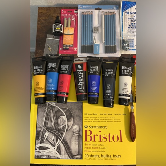| Characteristics of goods | #art #artsupplies #paint #charcoal Comes with 24 inch ruler, 2 nibs, vine charcoal, palette paper, fixative with a new spray bottle, palette knife, graphite pencil set, black ink, 2 black fine tip pens, 14x17 and 9x12 bristol papers, 8 different paints. Bought everything for about $250 and will be selling for $105 with free shipping! Everything was barely used, the most used things were some paints (black and white) and the brushes. | ||